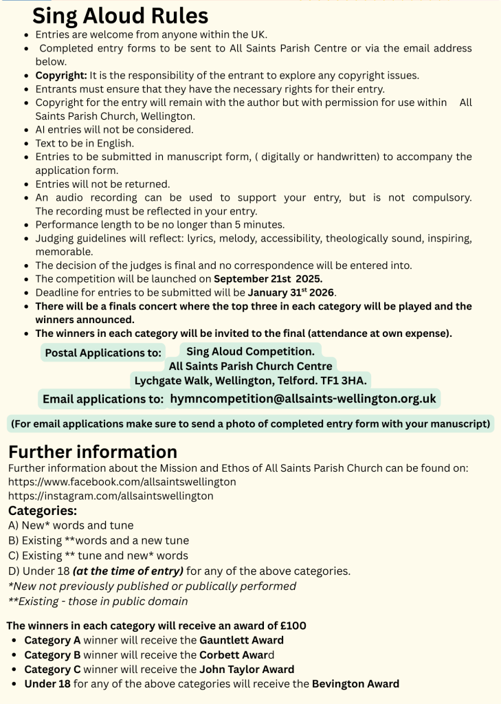 Email applications to: hymncompetition@allsaints-wellington.org.uk