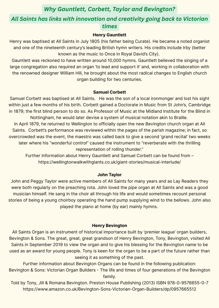 All Saints Organ is an instrument of historical importance; one of only a few outside London built by ‘premier league’ organ builders, Bevington. The great, great, great grandson of Henry Bevington, Tony, Bevington, visited All Saints in September 2019 to view the organ and to give his blessing for the Bevington name to be used as an award for young people. Tony is keen for the organ to be a part of the future rather than seeing it as something of the past.